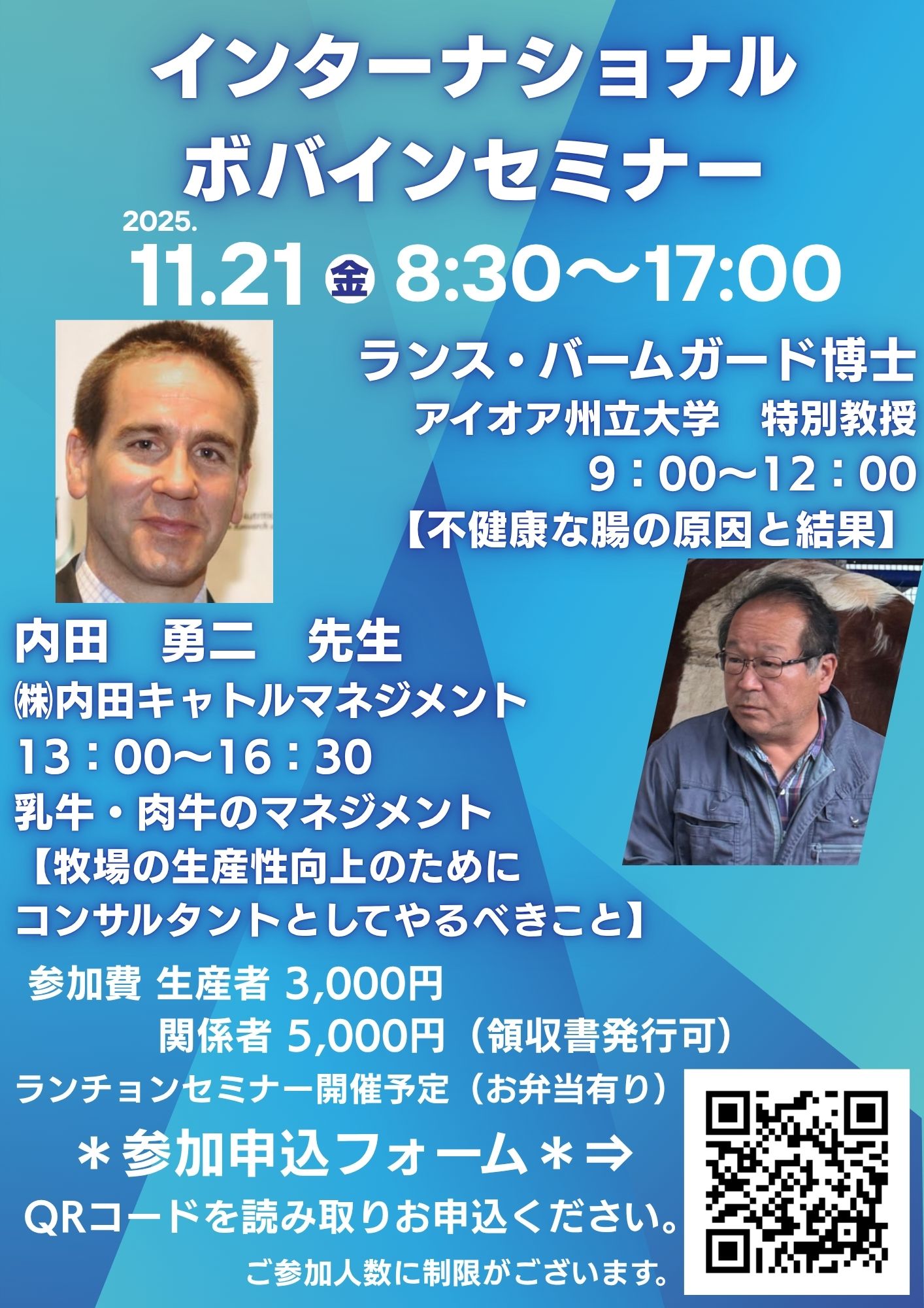 11月21日(金)8:30〜17:00、札幌コンベンションセンターにて「インターナショナル ボバインセミナー」が開催される。