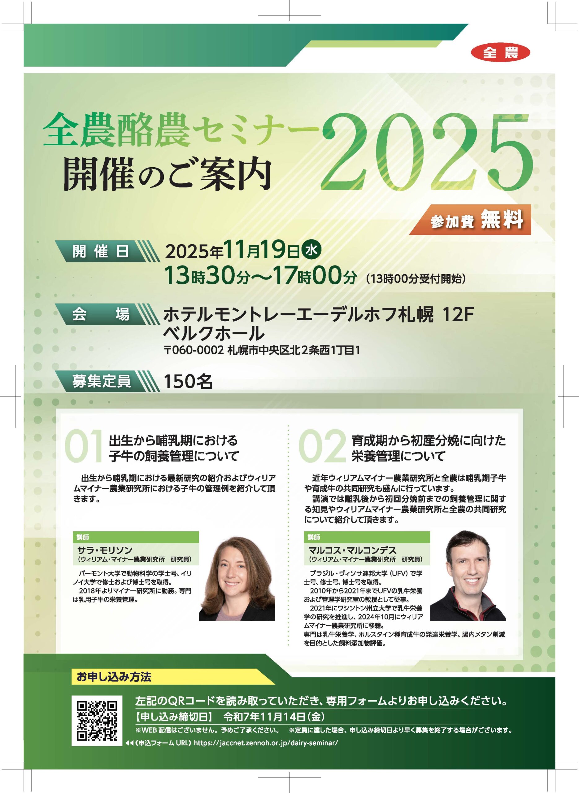 全国農業協同組合連合会(全農)は、ウィリアム・マイナー農業研究所の研究者を講師に迎え、「全農酪農セミナー2025」を開催する。